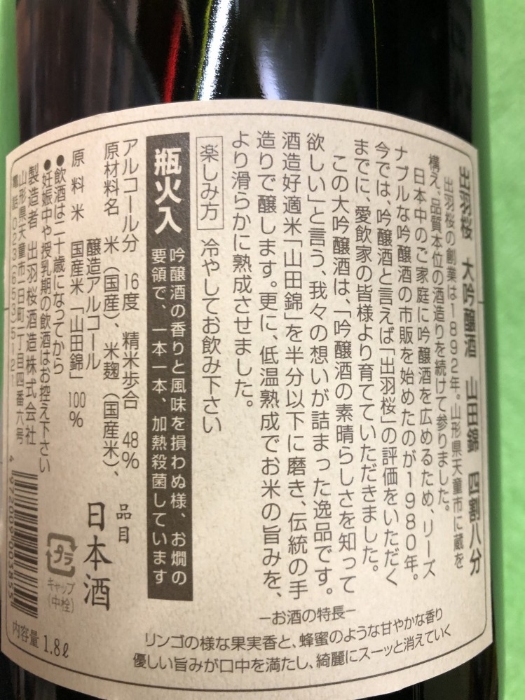 HOME > 商品一覧 > 山形県 出羽桜酒造 出羽桜 山田錦 四割八分 大吟醸 1800ml 要冷蔵商品