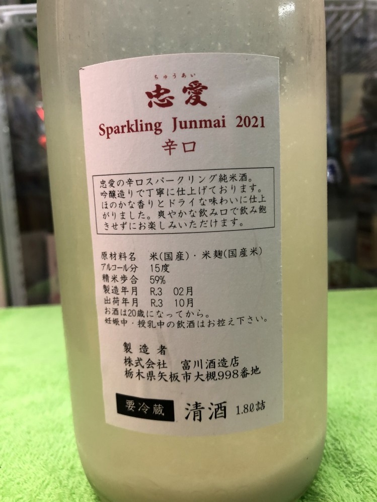 HOME > 商品一覧 > 栃木県 富川酒造店 忠愛 Sparkling Junmai(スパークリング純米) 辛口 1800ml 要冷蔵商品